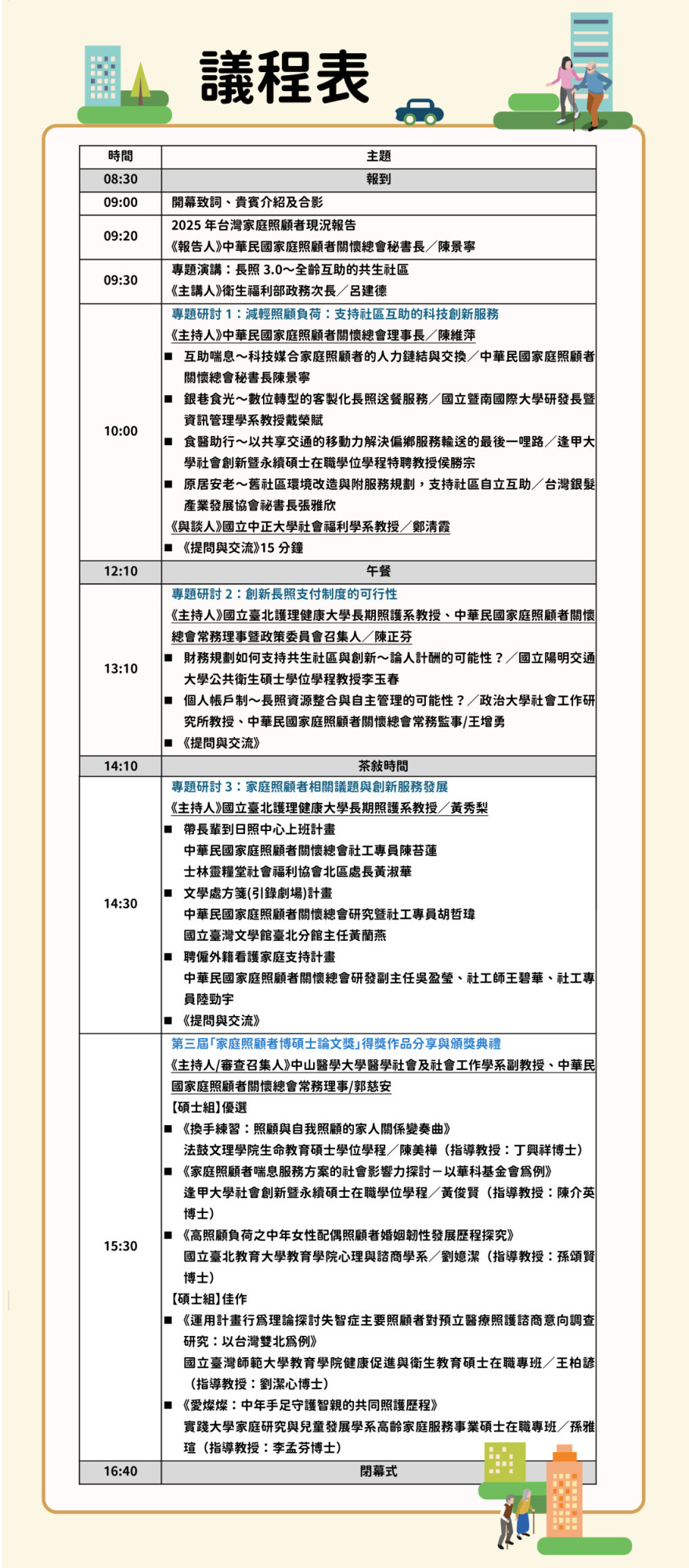 續辦「第三屆家庭照顧者博碩士論文獎頒獎暨發表會」,該獎項以「家庭照顧者」為題公開徵求博碩士論文。今年度共計收到2篇博士論文、24篇碩士論文投稿,來稿踴躍且領域及主題多元,顯示家庭照顧者議題已成為研究顯學,期盼成為推動家庭照顧者福祉的重要知識庫,俾作為台灣未來政策及服務規劃之參考。該獎項分別由家總常務監事王增勇頒發優選作品,東海大學社會工作系助理教授歐紫彤頒發佳作作品,肯定五位得獎,現場並邀請分享。