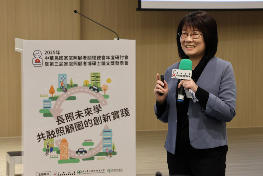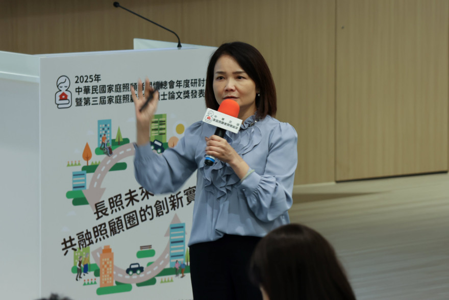 陳景寧以「互助喘息:串起社區共照力量」為題,分享家總近三來,與國北護合作之「互助喘息」計畫,由一位照服員搭配照顧者志工,照顧四到六失能失智或身心障礙者,照顧者「值一天喘兩天」,形成一個小型的時間銀行,讓社區就近成為家庭照顧者喘息與支持的後盾。為提高服務效能,掌握排班與換工,導入科技建置平台,有別於初期的人工作業,大大提升工作效率,2026年將於全國廣布50個據點,讓在地照顧者都能有機會獲得喘息。