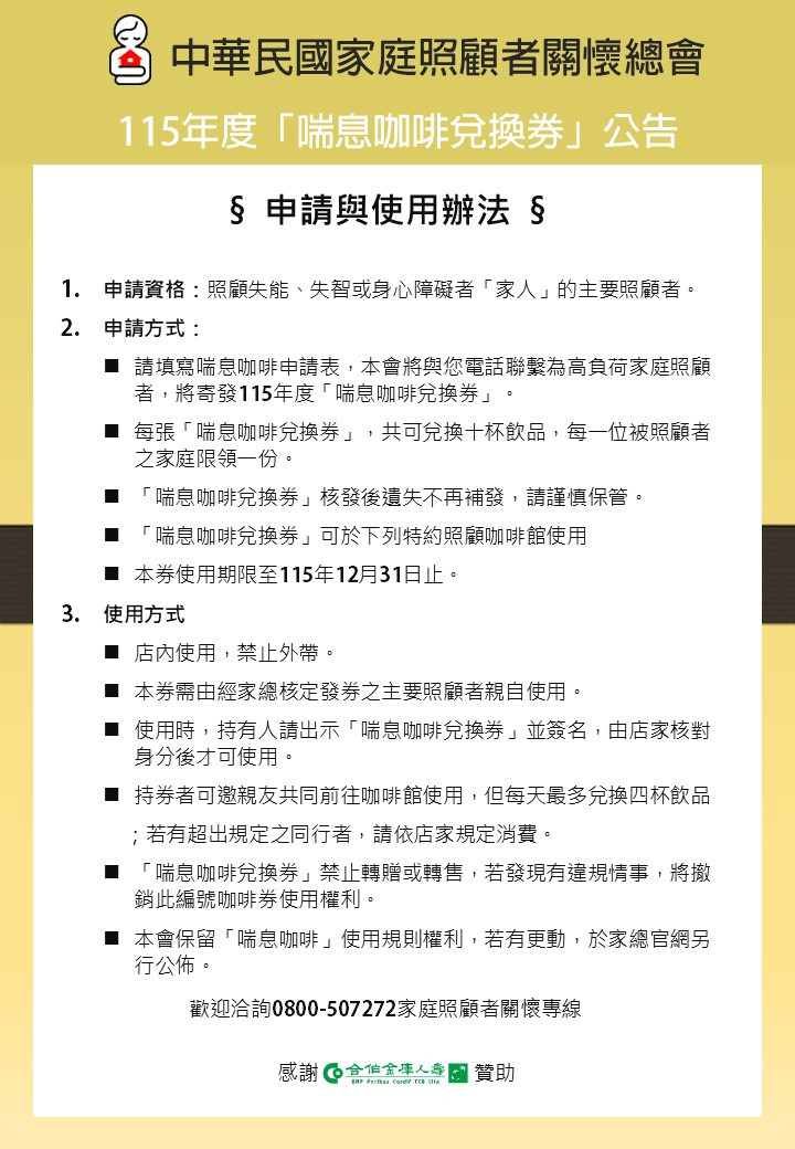 115年度的「喘息咖啡」開始申請囉,新的一年,家庭照顧者要更疼愛自己,讓自己喘息一下。為了陪伴更多的照顧者朋友走出照顧環境,進入照顧咖啡館放鬆,115年度持續發行好友券 (於以下特約咖啡館內可享用一杯飲品),歡迎各位朋友關心身邊的照顧者朋友。